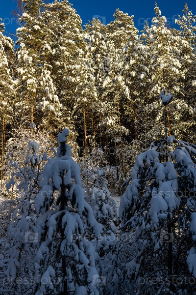 Заснеженный лес в тайге в зимний день. красивый пейзаж зимнего хвойного леса. заснеженные ели