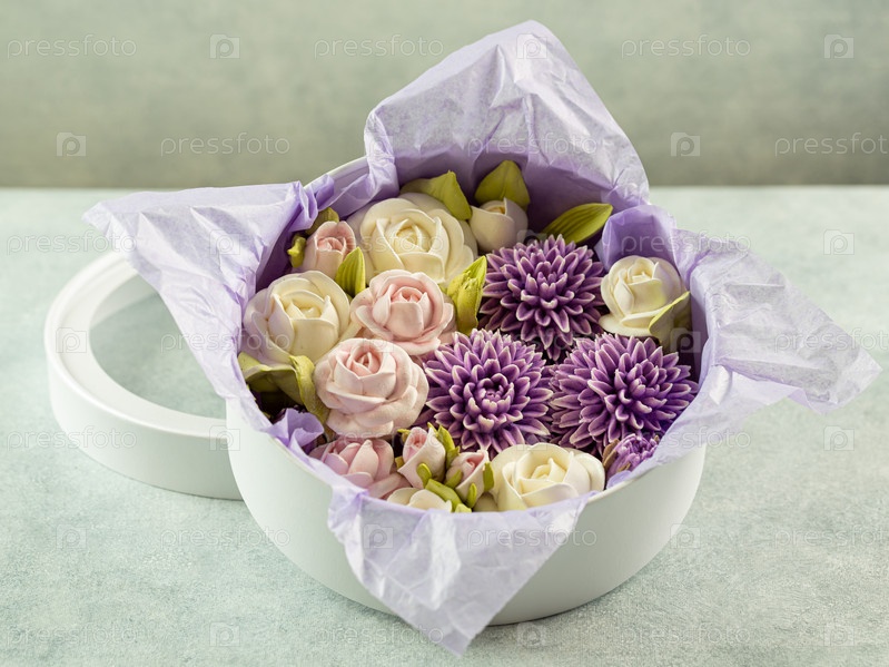 Зефирный букет цветов в подарочной коробке на светлом фоне