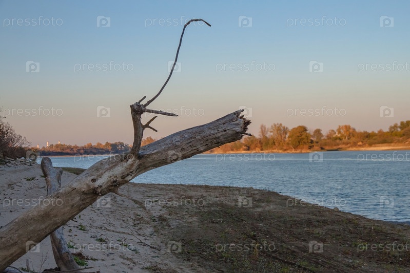 Сухое бревно на фоне закатного неба и синей речной воды