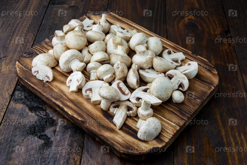 Обожженная разделочная доска со свежими целыми и нарезанными шампиньонами на темном деревянном фоне