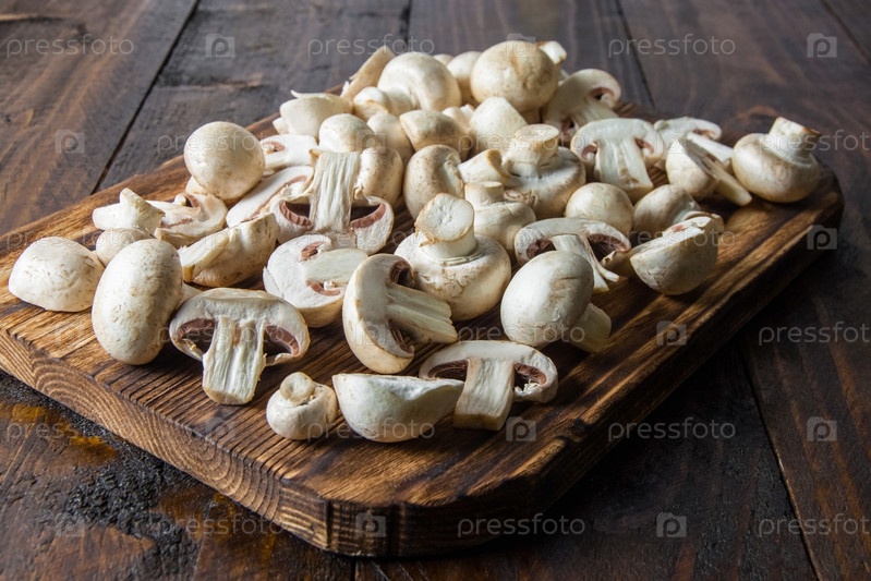 Темная разделочная доска со свежими грибами на темном деревянном фоне