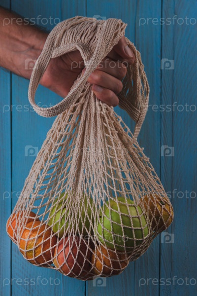 Мужчина держит хлопковую сетку с органическими фруктами на деревенском синем фоне. Экологически чистая концепция безотходного производства
