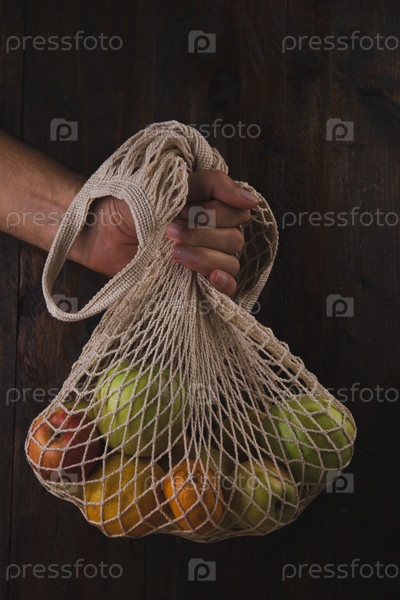 Мужская рука с сетчатой сумкой для покупок с органическими фруктами на темной деревянной доске. Экологичность, ноль отходов, концепция без пластика