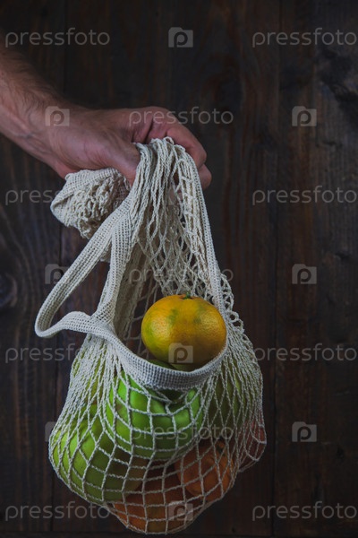 Мужская рука с сетчатой сумкой для покупок с органическими фруктами на темной деревянной доске. Экологичность, ноль отходов, концепция без пластика