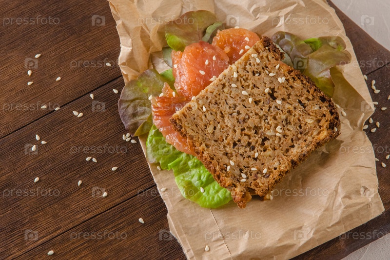 Бутерброд с цельнозерновым хлебом, лососем и салатом на крафт-бумаге