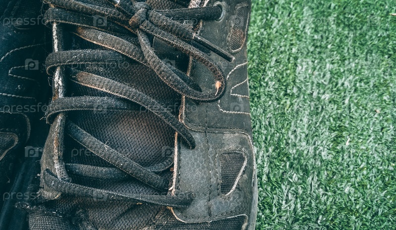Грязные старые кроссовки на зеленом фоне