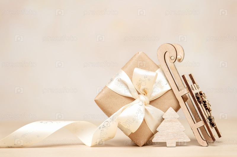 Маленькие сани, декоративные елки и подарочные коробки на деревянном столе на размытом фоне