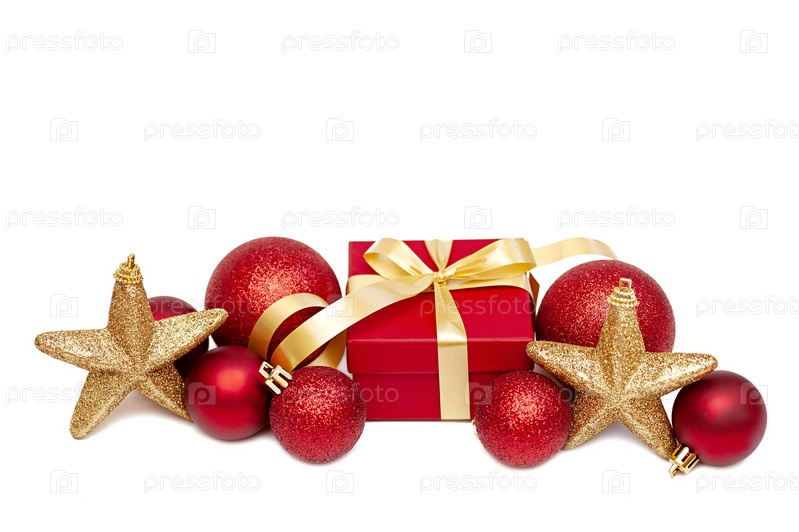 Новогодние украшения и подарочная коробка на белом фоне