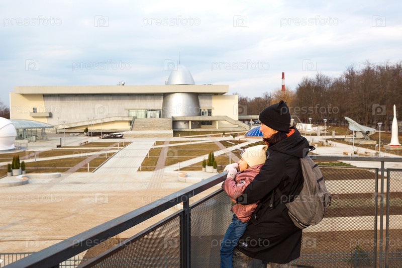 Калужский музей космонавтики - подготовка к открытию 2-й очереди. Мать и дочь на смотровой площадке перед музеем. 7 апреля 2021 г., Калуга, Россия