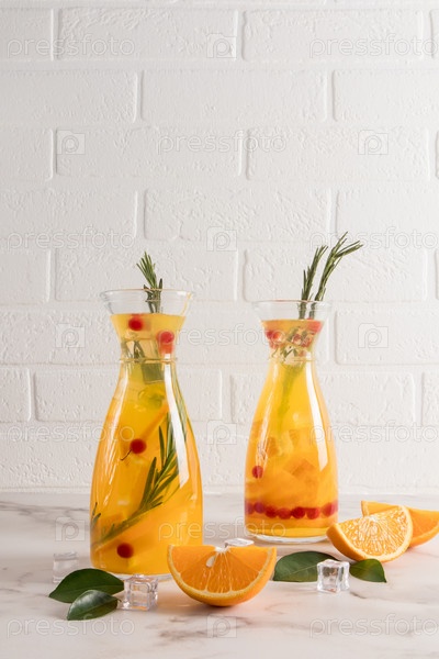 Два стеклянных современных графина с витаминной водой из апельсина и ягод, кусочки льда на белом мраморном столе напротив кирпичной стены