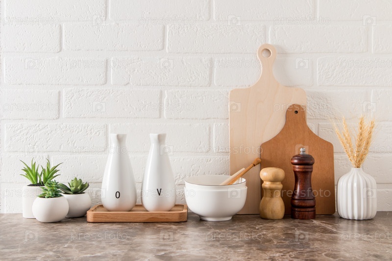 Различная кухонная утварь на мраморной столешнице в современной кухне. концепция декора на фоне белой кирпичной стены