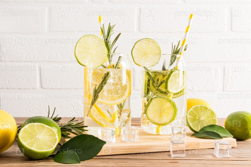 Вкусные полезные безалкогольные напитки с дольками лайма и лимона, веточками розмарина и кубиками льда в жаркий день. детокс меню