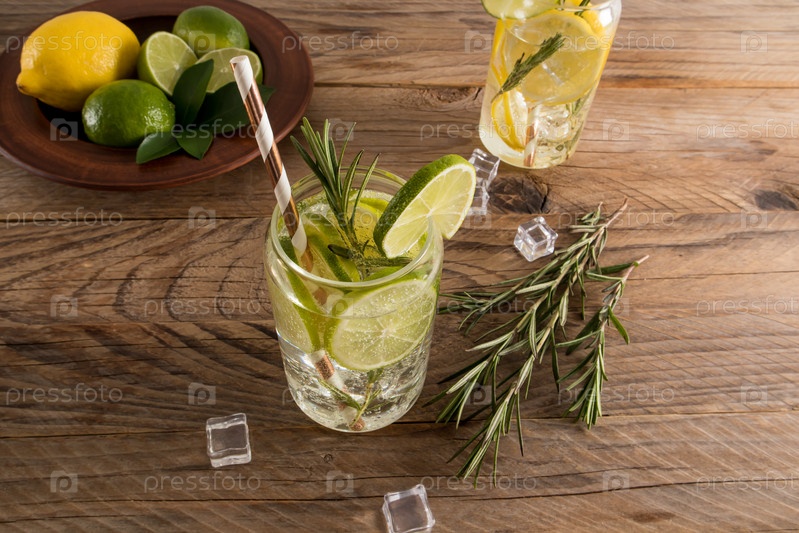 Стакан фруктовой воды лайма, кубики льда и розмарин. освежающий летний напиток. деревянный коричневый фон с фруктами и кубиками льда