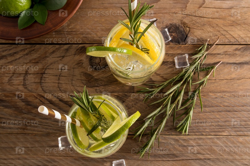 Вид сверху на два стакана с вкусным освежающим цитрусовым напитком с кубиками льда и розмарином. деревянный фон