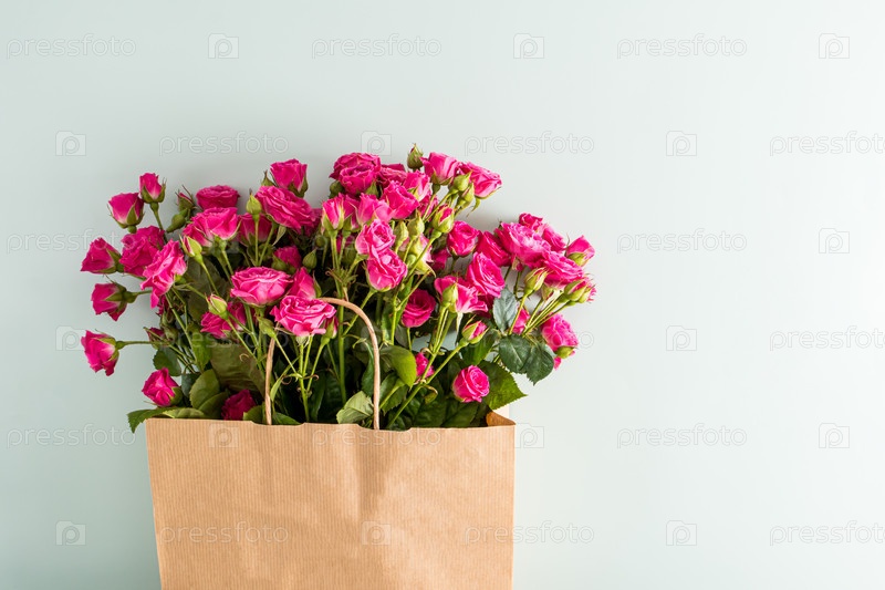 Крафт-бумажный пакет с красивыми розами на пастельном фоне. концепция подарка на праздники
