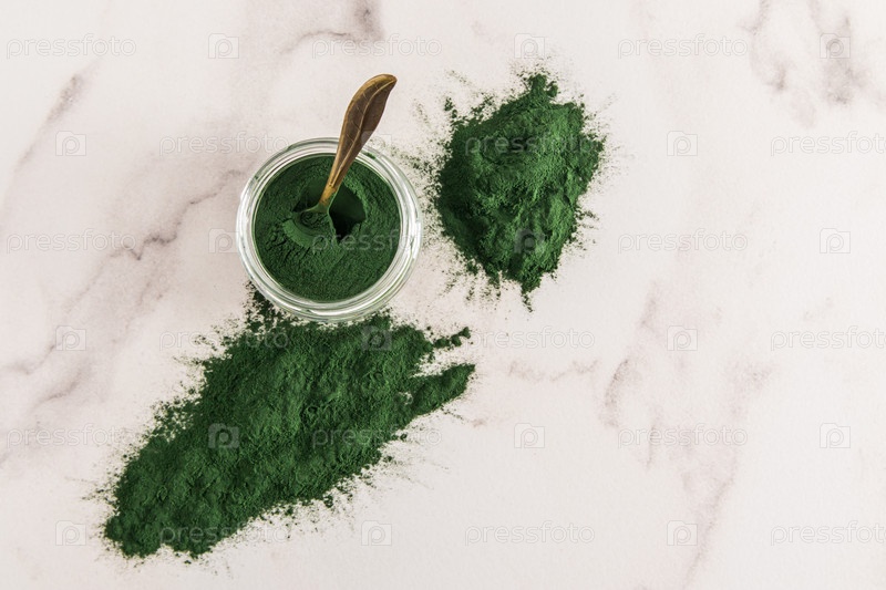 Разбросанный порошок спирулины на мраморном белом фоне и стеклянная банка с органической пищевой добавкой. чистка кузова такси