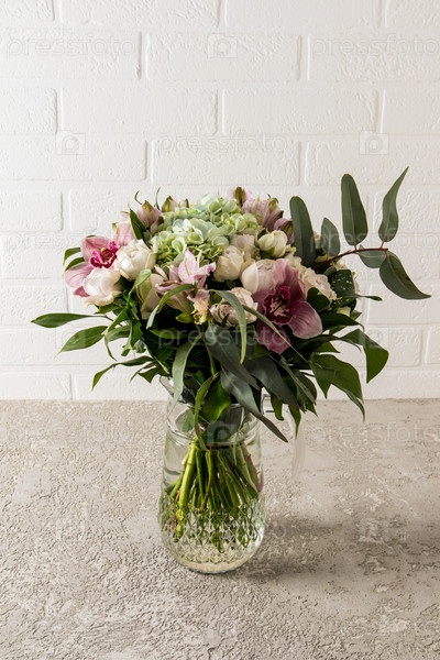 Красивый букет садовых роз в стеклянной вазе на сером бетонном столе у большой кирпичной стены. концепция подарка, ромбическое настроение
