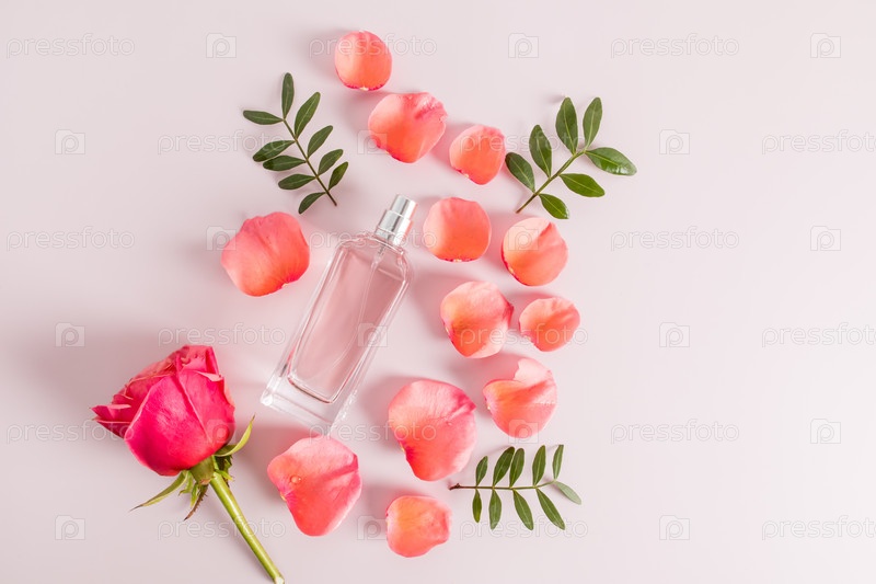 Стеклянная прозрачная бутылка туалетной воды или духов на нежном розовом фоне с лепестками роз и цветов. плоская планировка. вид сверху