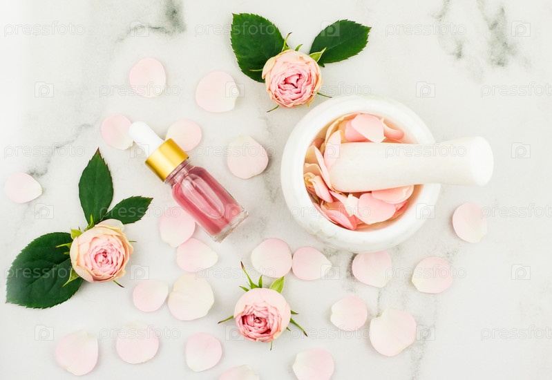 Вид сверху на бутылку с розовым косметическим маслом, ступкой и пестиком с лепестками роз, цветами, зелеными листьями