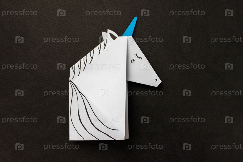 Белый единорог выполнен в технике оригами на черном фоне. С местом для вашего текста