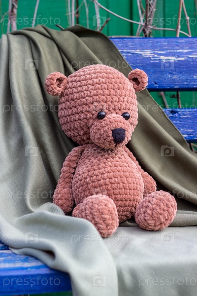 Плюшевый мишка на скамейке с зеленым шарфом. Игрушка ручной работы. Вязание крючком. Вертикальное фото