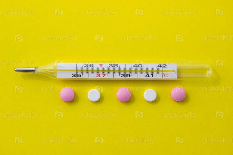 Медицинский термометр и таблетки на желтом фоне с местом для вашего дизайна