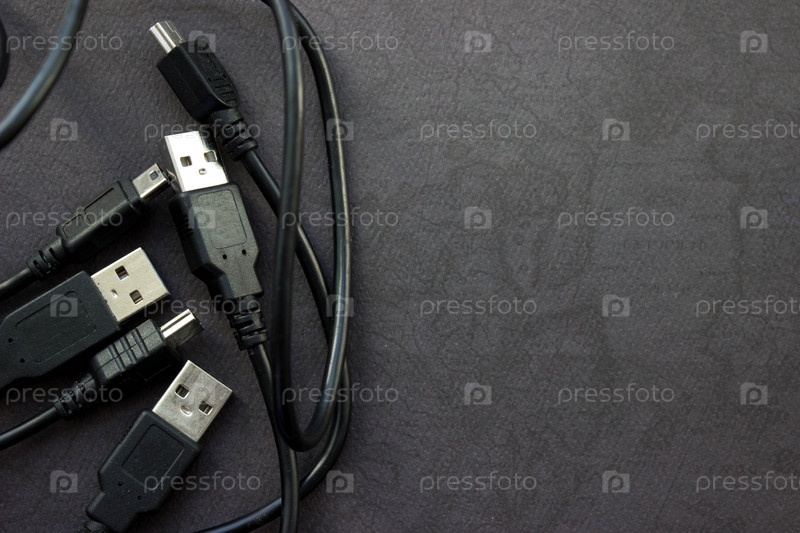 Закройте кабели USB и mini-USB на черном фоне с местом для вашего дизайна