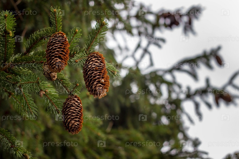 Еловые шишки на дереве в левой части фото. Зеленая природа для здорового образа жизни