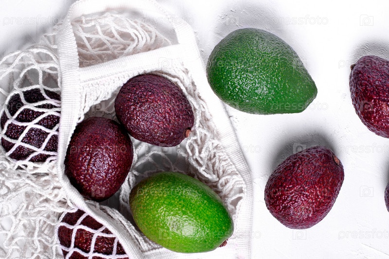 Зеленый и фиолетовый авокадо в экологически чистой сетчатой сумке на белом фоне. Выбор устойчивого развития
