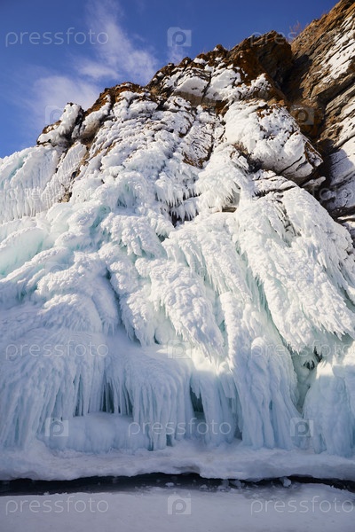 Скалы покрыты снегом и сосульками. Замерзшее озеро Байкал