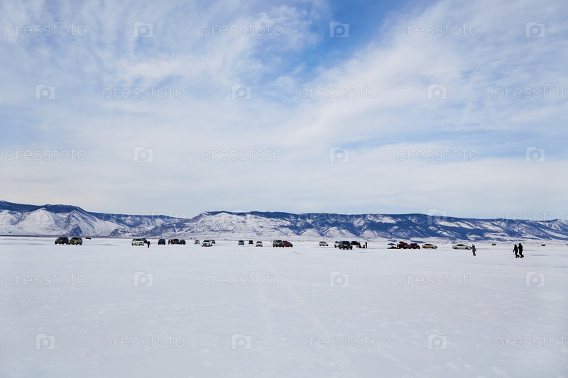 Зимнее путешествие по замерзшему Байкалу. Популярное место отдыха, многие туристы приезжают на машине по льду