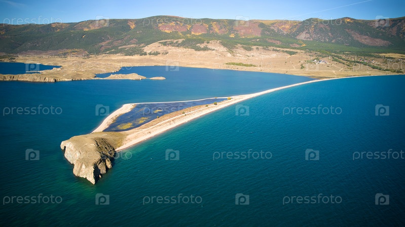 Озеро Байкал с воздуха. Вид на залив у поселка Курма летом, мыс Уюга