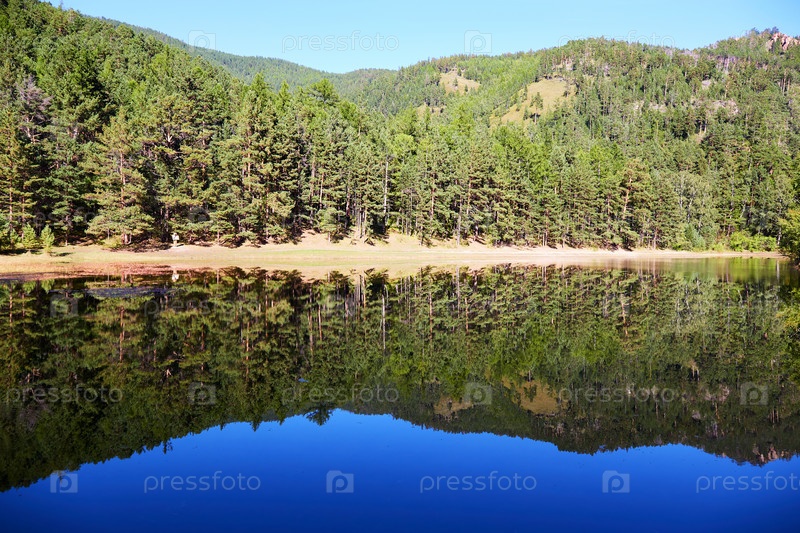 Озеро, сосновый лес. Деревья отражаются в воде. Красивый лесной пейзаж в солнечный летний день