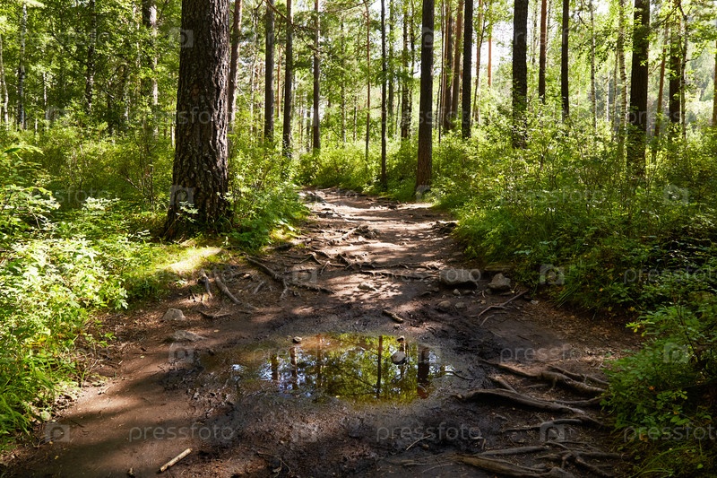 Живописный лес после дождя. Корни деревьев, выступающие над поверхностью земли