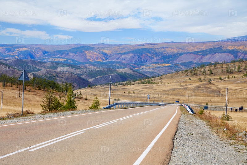 Асфальтированная пустая дорога к озеру Байкал. Красивый пейзаж в окружении гор