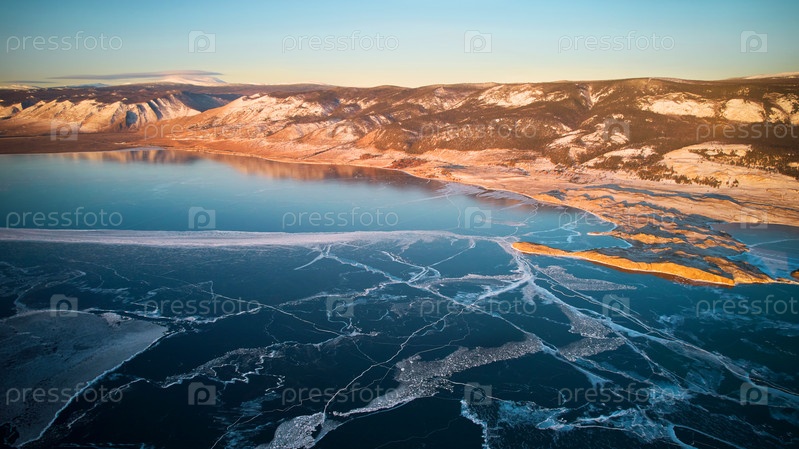 Вид на замерзший Байкал с воздуха. Прозрачный лед с трещинами. Зимний пейзаж