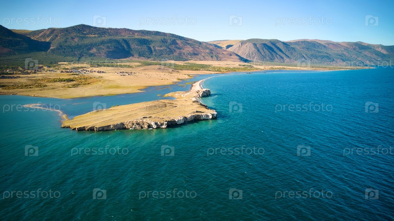 Озеро Байкал с воздуха. Вид на залив у поселка Курма