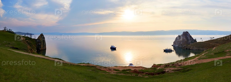 Закат на озере Байкал, остров Ольхон летом. Панорамный вид на Хужир Бай и цепь Бурхан, Шаманка