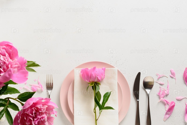Весенняя сервировка стола с розовыми цветами пиона на белом столе. Вид сверху