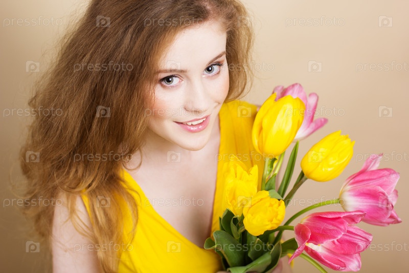 Красивая рыжеволосая девушка с тюльпанами