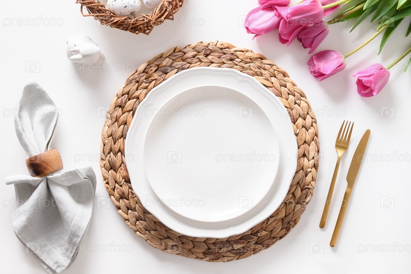 Пасхальный ужин с яйцами, кроликом, праздничной посудой и тюльпанами на белом