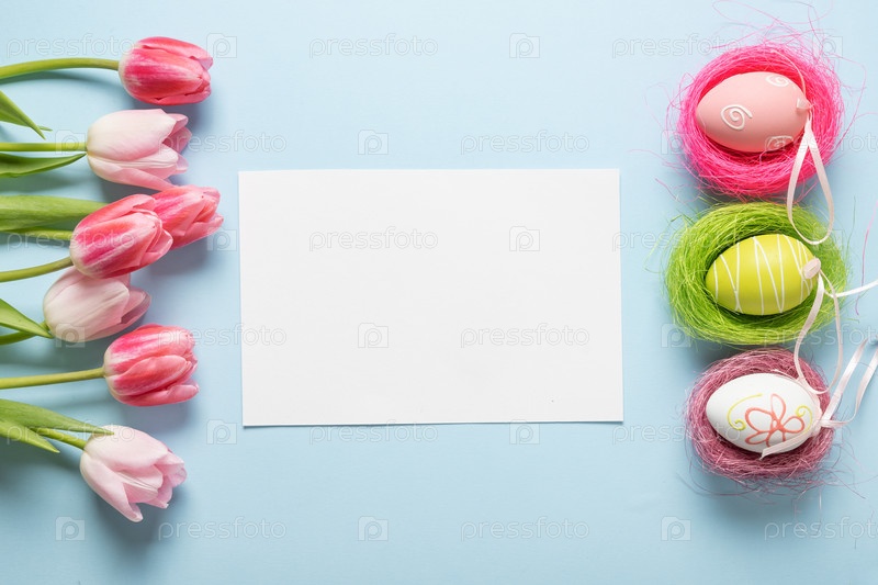 Пасхальный бланк с гнездом, яйцами, тюльпанами на синем фоне