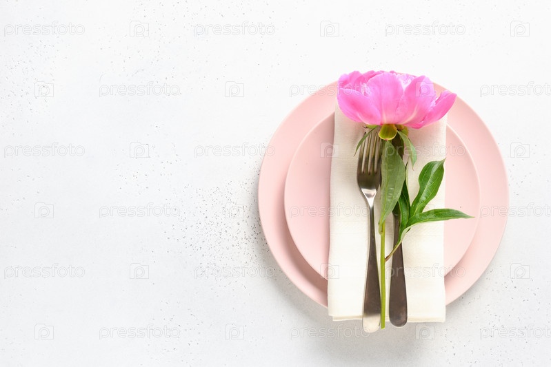 Праздничная сервировка стола с розовыми цветами пиона на белом столе. Вид сверху
