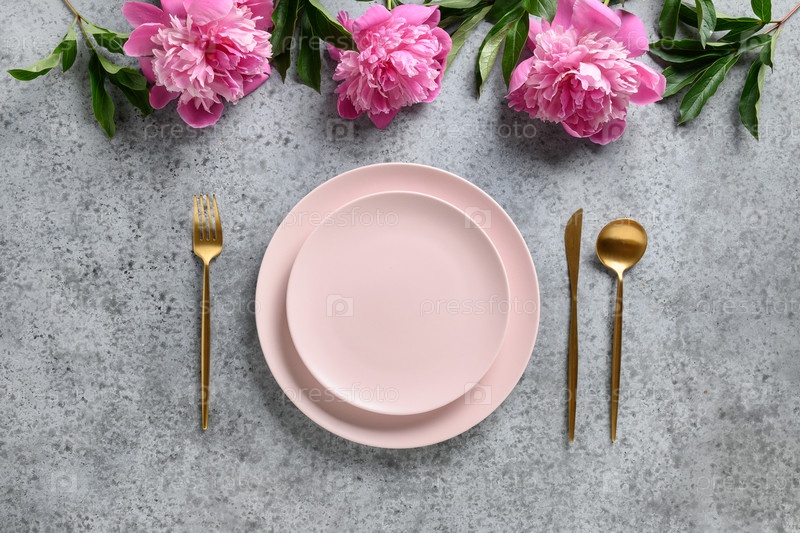 Элегантная сервировка стола с цветами пиона на сером камне. Вид сверху