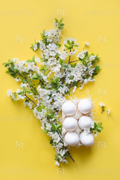 Весенняя композиция из куриных белых яиц со свежими цветами в фарфоровой коробочке. Пасхальный