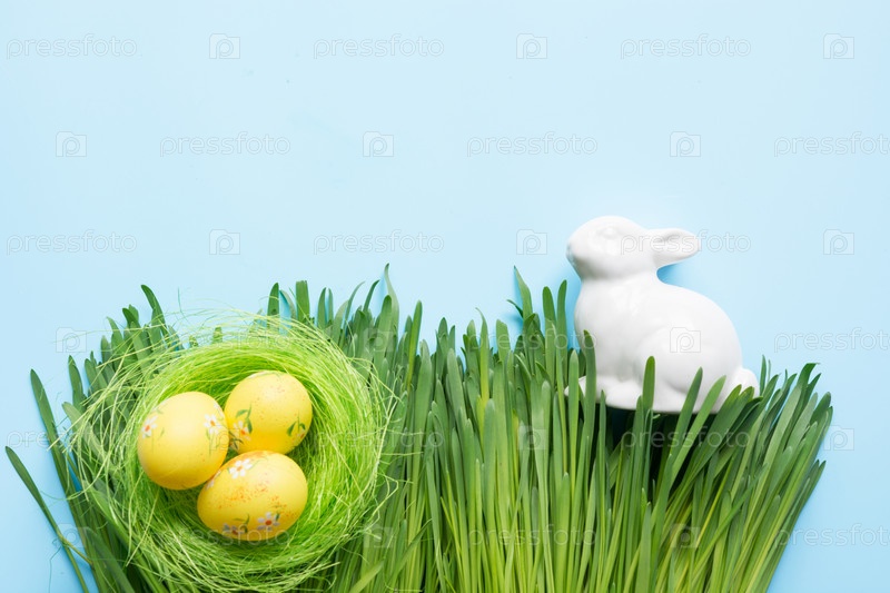 Пасхальная композиция из желтых яиц в гнезде и кролика в траве. Место для текста