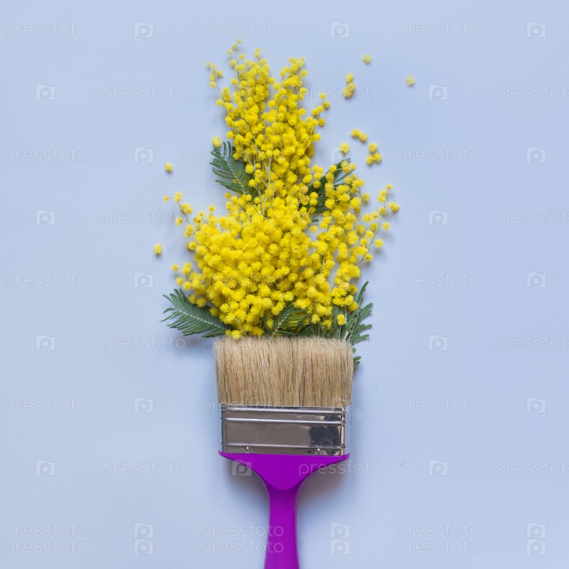 Желтые цветы мимозы и фиолетовая кисть на синем. Креативная плоская планировка. Весна