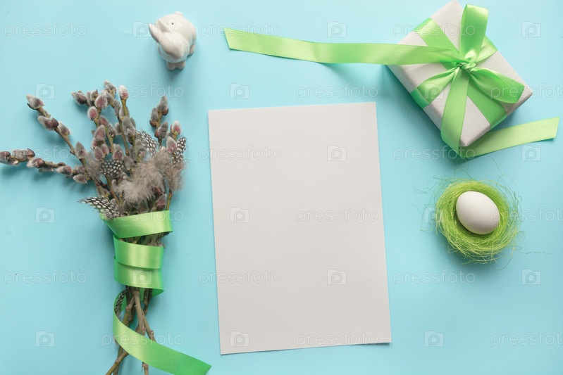 Пасхальный. Пук вербы и подарок на голубом. Место для текста