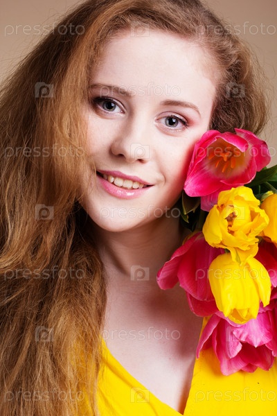 Красивая рыжеволосая девушка с тюльпанами