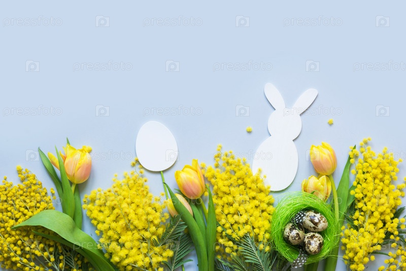 Пасхальная и весенняя рамка из желтых тюльпанов, мимоза на синем. Вид сверху с копией пространства